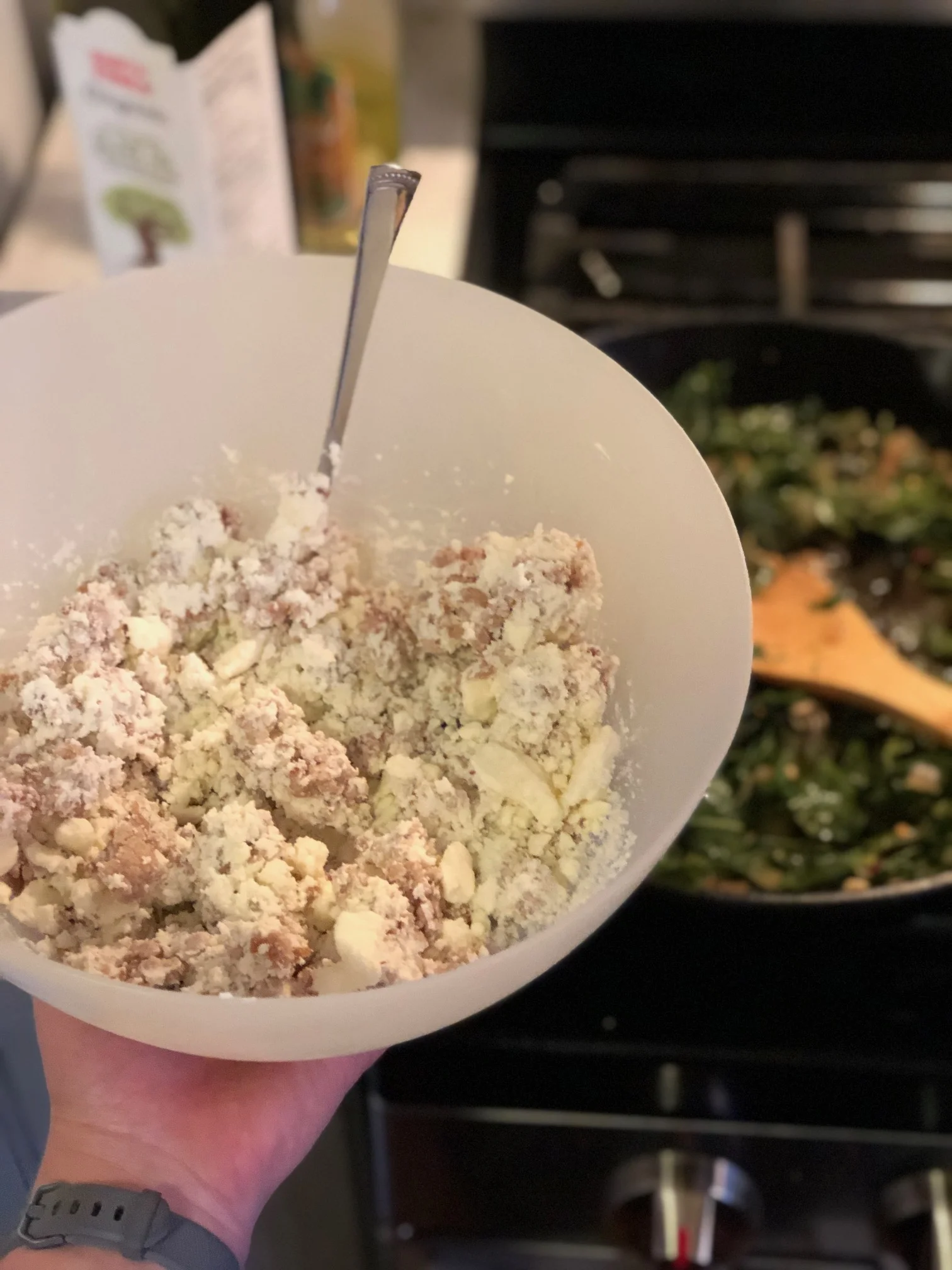 In a large bowl, crack 2 eggs and whisk together. Add the ricotta and the feta, and mix well. Add the cooked ground sausage and blend in. Set aside until greens are ready.